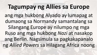 Tagumpay ng mga Alyadong Bansa sa Europe at Hilagang Africa. Ang Ikalawang Digmaang Pandaigdig o ang World War II madalas na pinapaikli sa WWII o WW2 ay isang global na digmaan na naganap sa pagitan ng. Nabago ang mapa ng Europa at bĂlang.